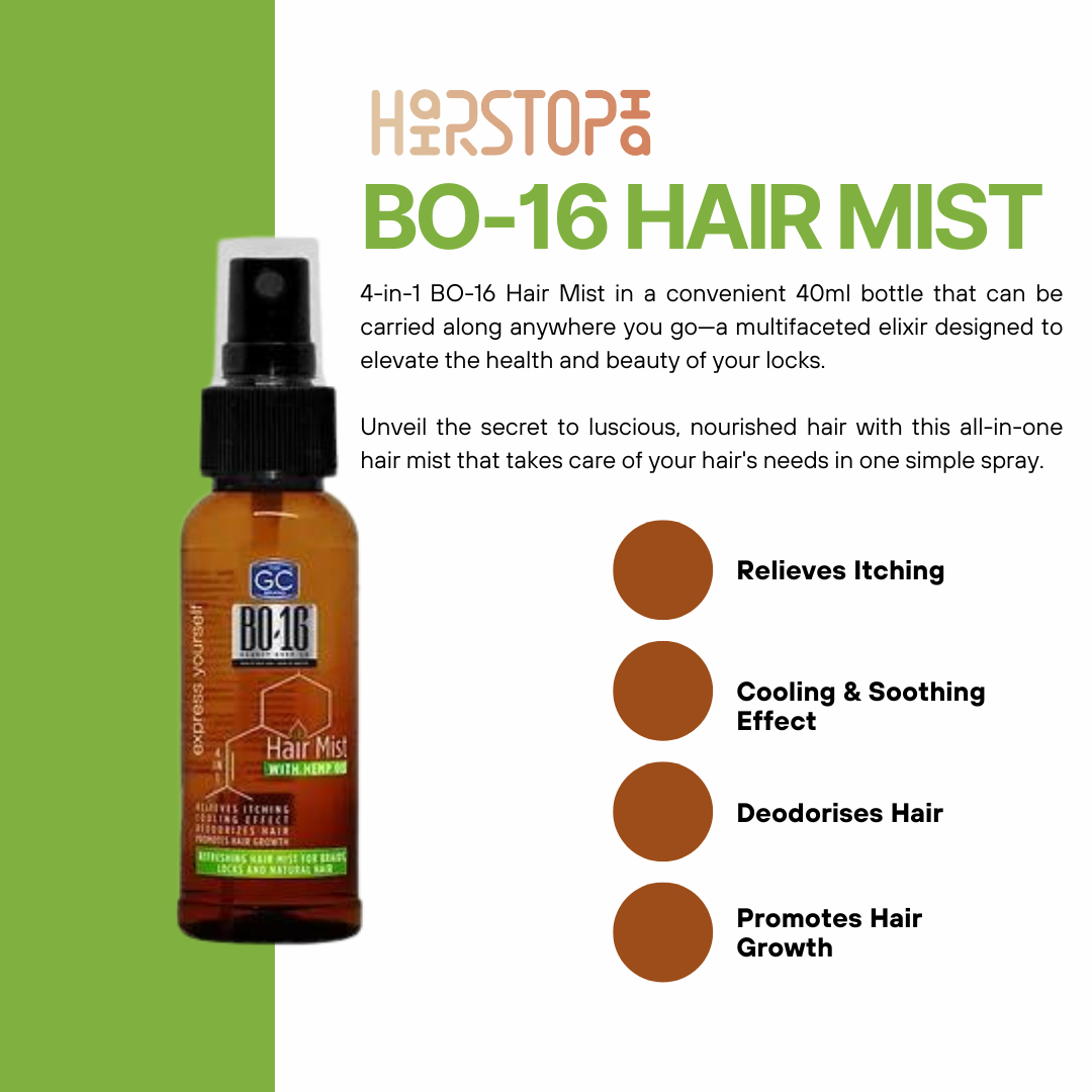 Transform your hair care routine with the 4-in-1 BO-16 Hair Mist in a convenient 40ml bottle that can be carried along anywhere you go—a multifaceted elixir designed to elevate the health and beauty of your locks. Unveil the secret to luscious, nourished hair with this all-in-one hair mist that takes care of your hair's needs in one simple spray.